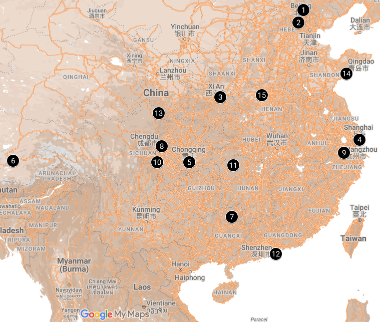 See map of China to review top attractions. For the best experience save locally to open with google maps/share with your friends to help plan your next adventure! Some locations are hidden behind others, click map to reveal full details: