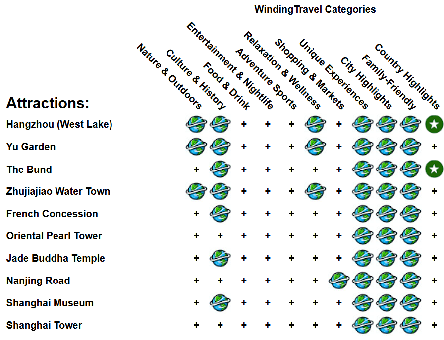 | French Concession | Wander through the French Concession, a historic area with tree-lined streets, trendy cafes, boutique shops, and charming colonial-era architecture. |