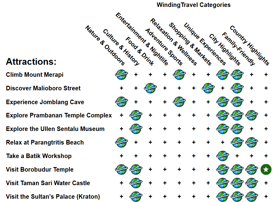 | Visit Borobudur Temple | Explore the world-famous Borobudur Temple, a UNESCO World Heritage site. This massive Buddhist temple is renowned for its intricate carvings and sunrise views. |
