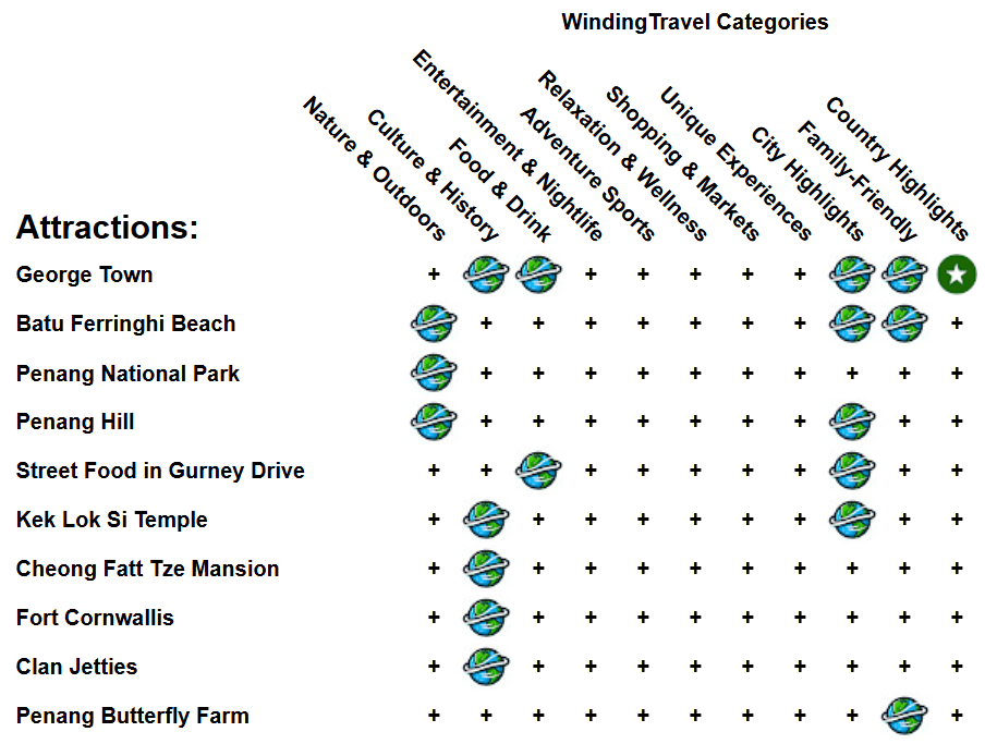 | George Town | Explore George Town, a UNESCO World Heritage site known for its well-preserved colonial architecture, vibrant street art, and rich multicultural heritage. |