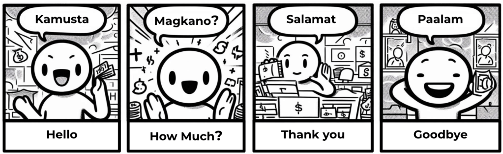 The main language spoken is Filipino. Below are some key phrases (phonetic translation) to get you started. A big smile and a few words can get you a long way!