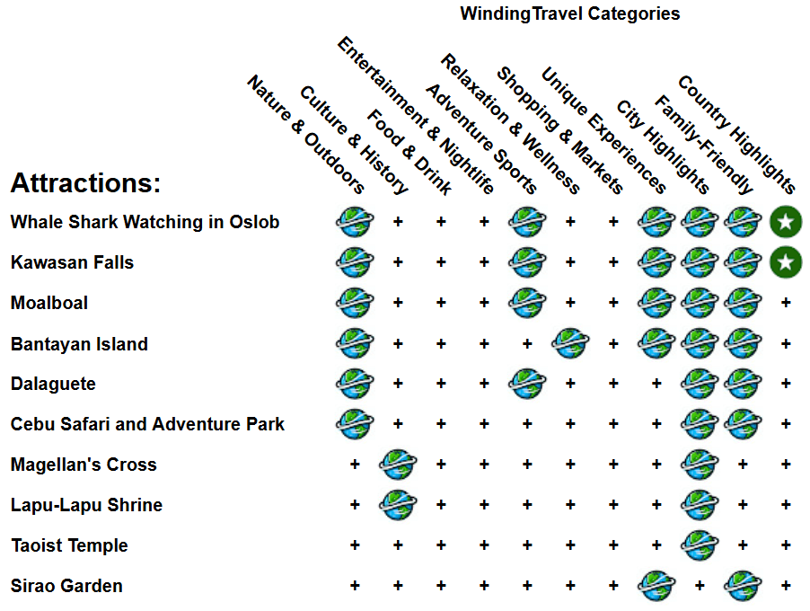 | Cebu Safari and Adventure Park | Experience the Cebu Safari and Adventure Park, home to various exotic animals and adventure activities, ideal for families and animal lovers. |