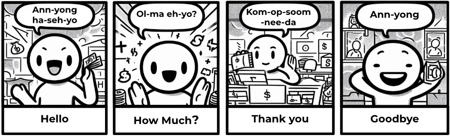 The main language spoken is Korean. Below are some key phrases (phonetic translation) to get you started. A big smile and a few words can get you a long way!