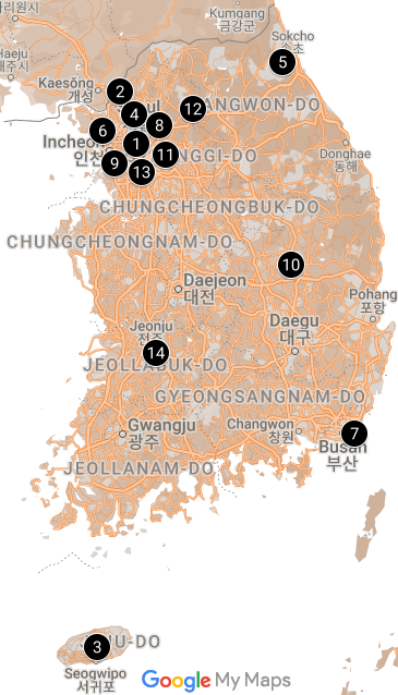 See map of South Korea to review top attractions. For the best experience save locally to open with google maps/share with your friends to help plan your next adventure! Some locations are hidden behind others, click map to reveal full details: