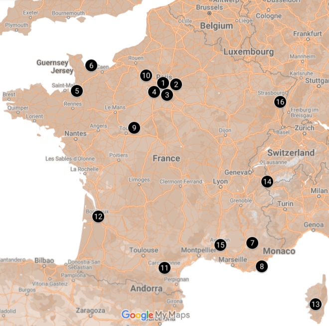 See map of France to review top attractions. For the best experience save locally to open with google maps/share with your friends to help plan your next adventure! Some locations are hidden behind others, click map to reveal full details: