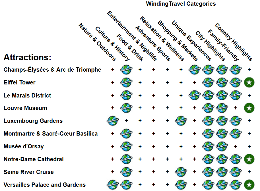 | Seine River Cruise | Take a cruise along the Seine River to see Paris’s landmarks from the water, including the Eiffel Tower, Louvre, and Notre-Dame, while enjoying a relaxing boat ride. |