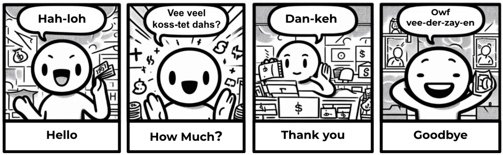 The main language spoken is German. Below are some key phrases (phonetic translation) to get you started. A big smile and a few words can get you a long way!