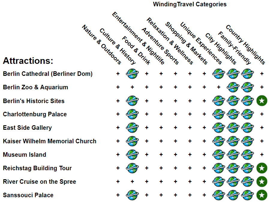 | Berlin’s Historic Sites | Explore Berlin’s rich history through iconic landmarks such as the Berlin Wall, Brandenburg Gate, and Checkpoint Charlie. |