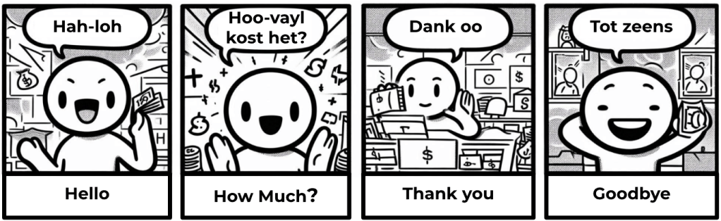 The main language spoken is Dutch. Below are some key phrases (phonetic translation) to get you started. A big smile and a few words can get you a long way!