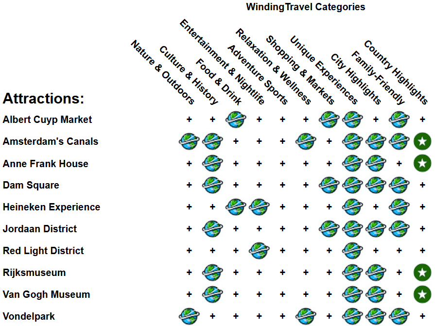 | Amsterdam’s Canals | Explore Amsterdam’s iconic canals by boat or on foot, taking in the picturesque bridges, historic homes, and bustling waterways that define the city. |