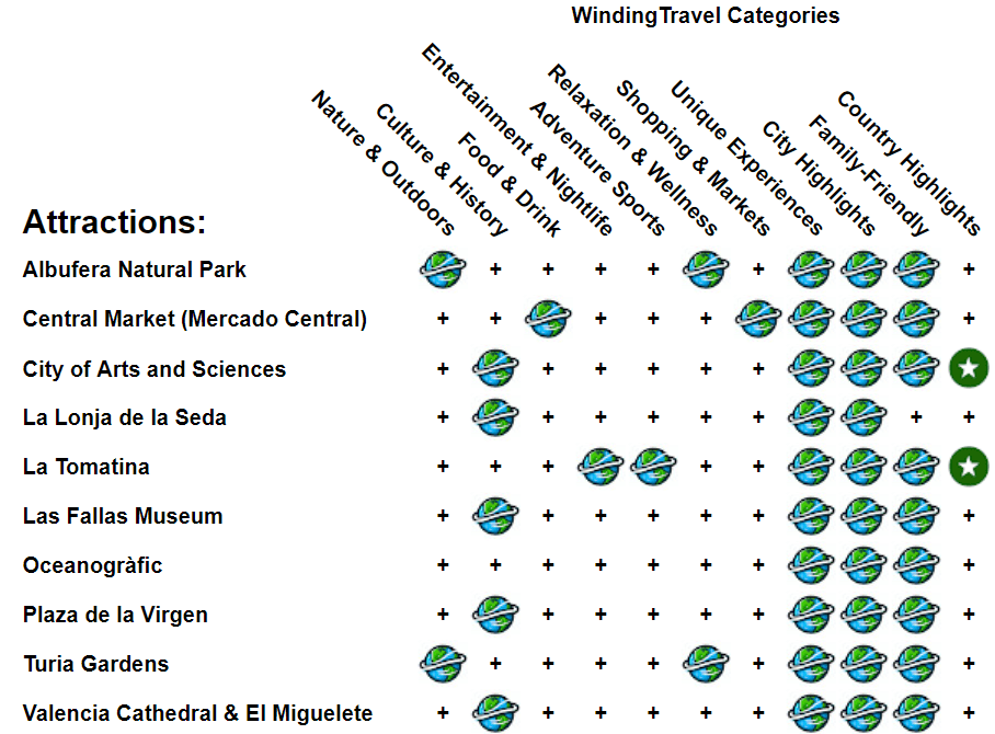| City of Arts and Sciences | Explore Valencia’s futuristic complex, featuring an opera house, science museum, oceanographic park, and IMAX cinema, blending modern architecture with educational experiences. |