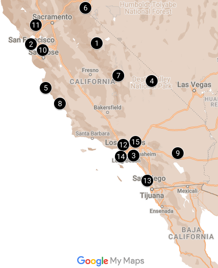 See map of California to review top attractions. For the best experience save locally to open with google maps/share with your friends to help plan your next adventure! Some locations are hidden behind others, click map to reveal full details: