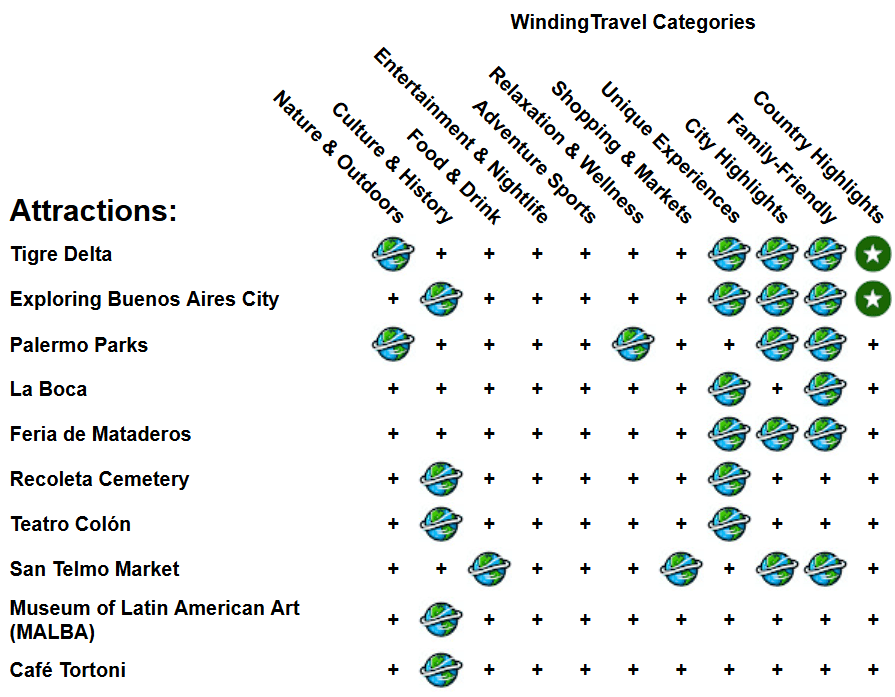| Tigre Delta | Take a boat trip to the Tigre Delta, a unique network of waterways and islands. Enjoy activities like kayaking or simply relax in this beautiful natural setting. |