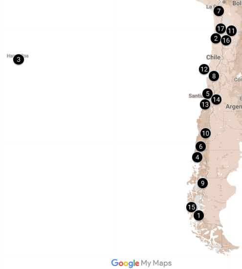 See map of Chile to review top attractions. For the best experience save locally to open with google maps/share with your friends to help plan your next adventure! Some locations are hidden behind others, click map to reveal full details: